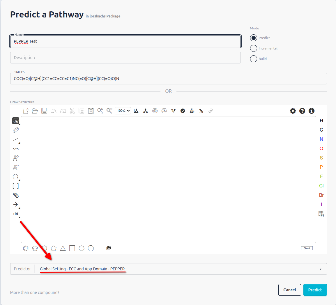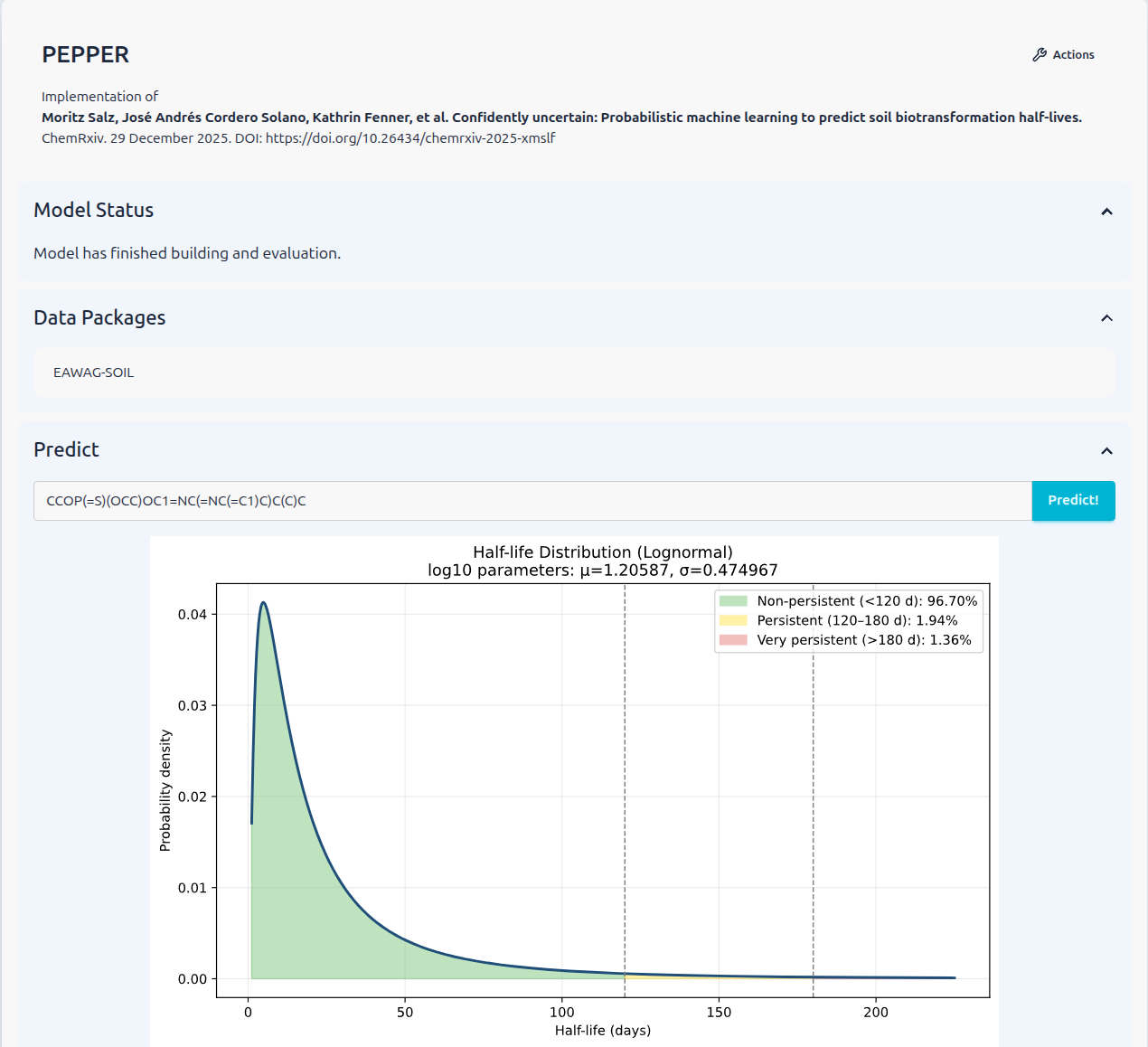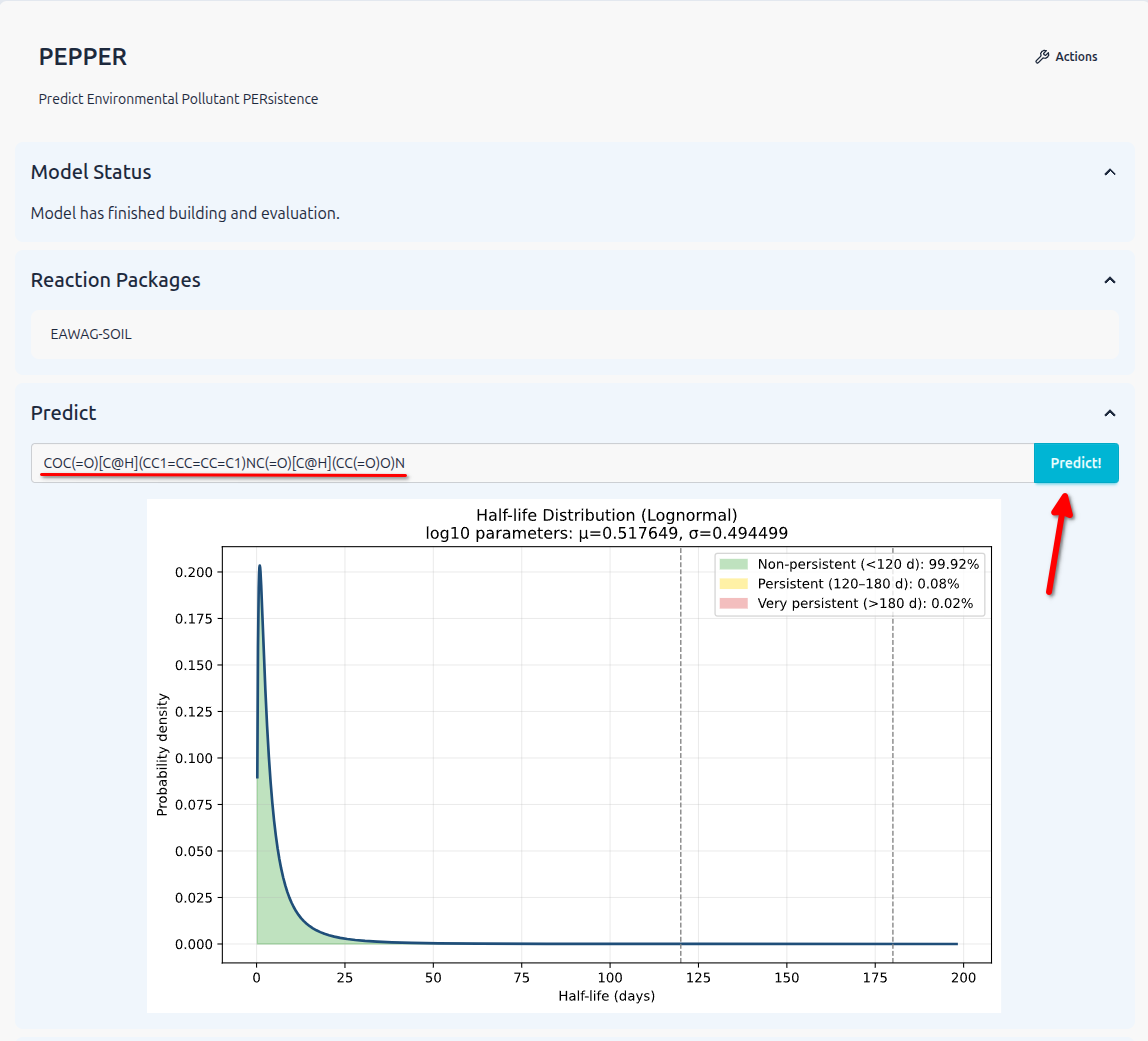 As with the other Models available in enviPath you can visit the Model Page and use the Model directly, by inserting a SMILES and hit the “Predict” button.